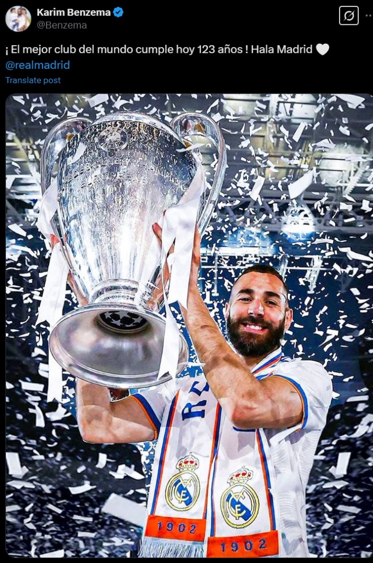 本澤馬在社媒配文寫道:“世界最佳俱樂(lè)部在今天迎來(lái)成立123周年紀(jì)念日,Hala Madrid!”